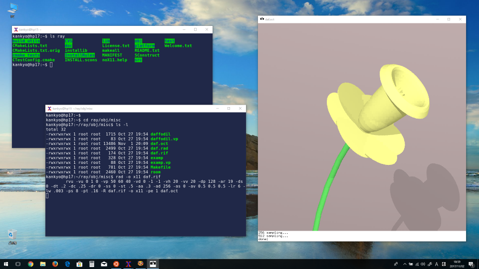 Windows10 (64bit) 、version 1809インストールを行う際に、その過程を忘備録として簡単なメモをとっていたのですが、Radianceをインストールしたい方の参考になればと思い、ここに記すことにしました。以下に、WSL上でRadianceを使用できるようにする一連の作業(ソースファイルのコンパイル、リンク、インストールなど)を示します。Linuxに不慣れな方にもなるべくわかりやすくと思い、Windowsで可能な作業はWindowsで行うように記述しています。